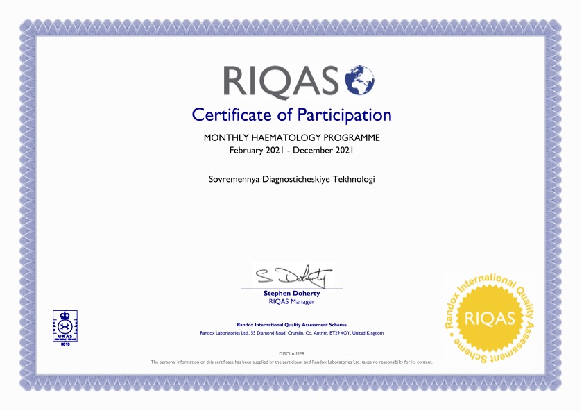 Регулярная работа над качеством нашей лаборатории подтверждена крупнейшей международной системой оценки качества RIQAS.